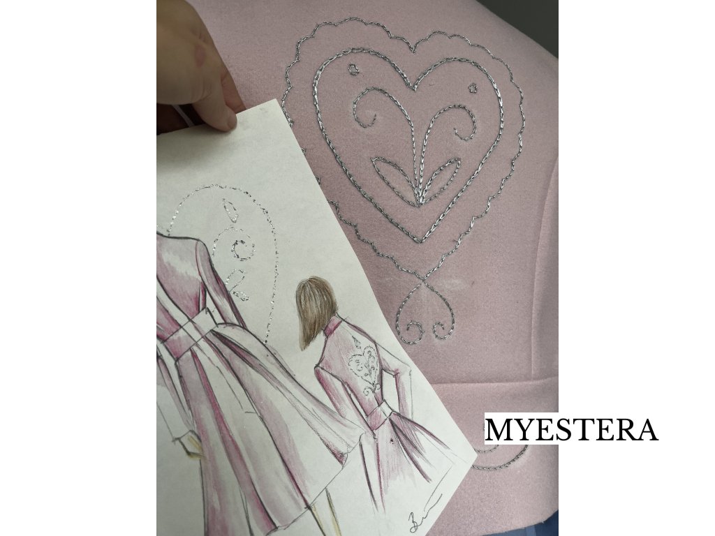 Na chrbáte je ručne vyšitý vzor folklórneho srdca. Do každého kabátu tak designérka vložila touto ručnou prácou kúsok seba.
